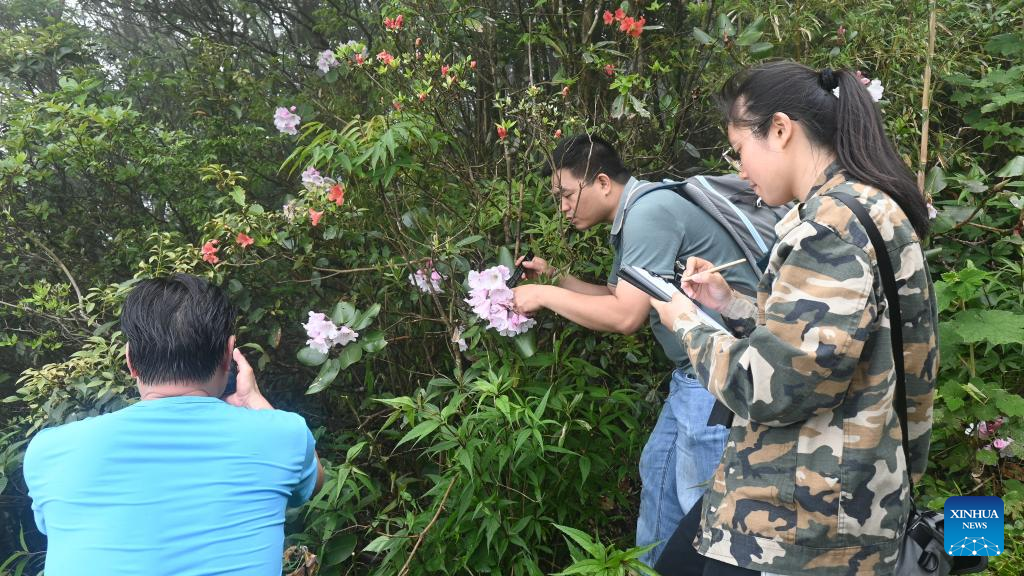 This undated photo shows researchers recording a new species of Rhododendron named Rhododendron yuanbaoshanense in Liuzhou, south China's Guangxi Zhuang Autonomous Region. (Photo by Deng Yihui/Xinhua)