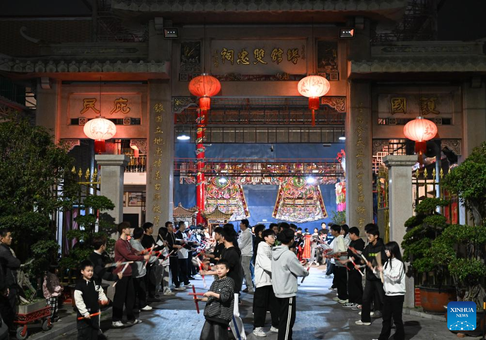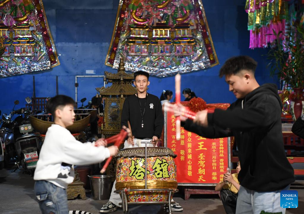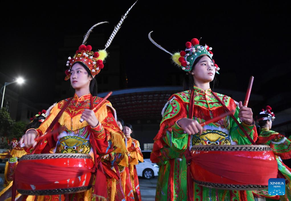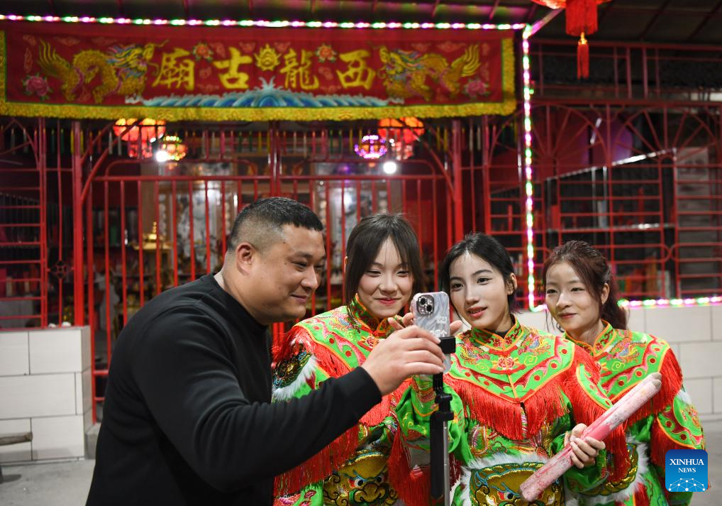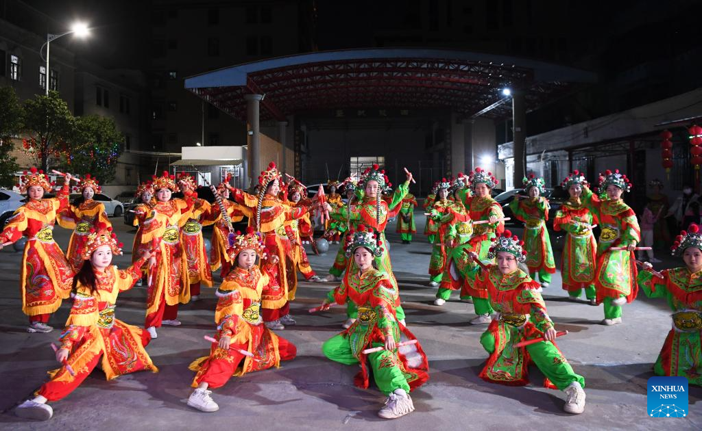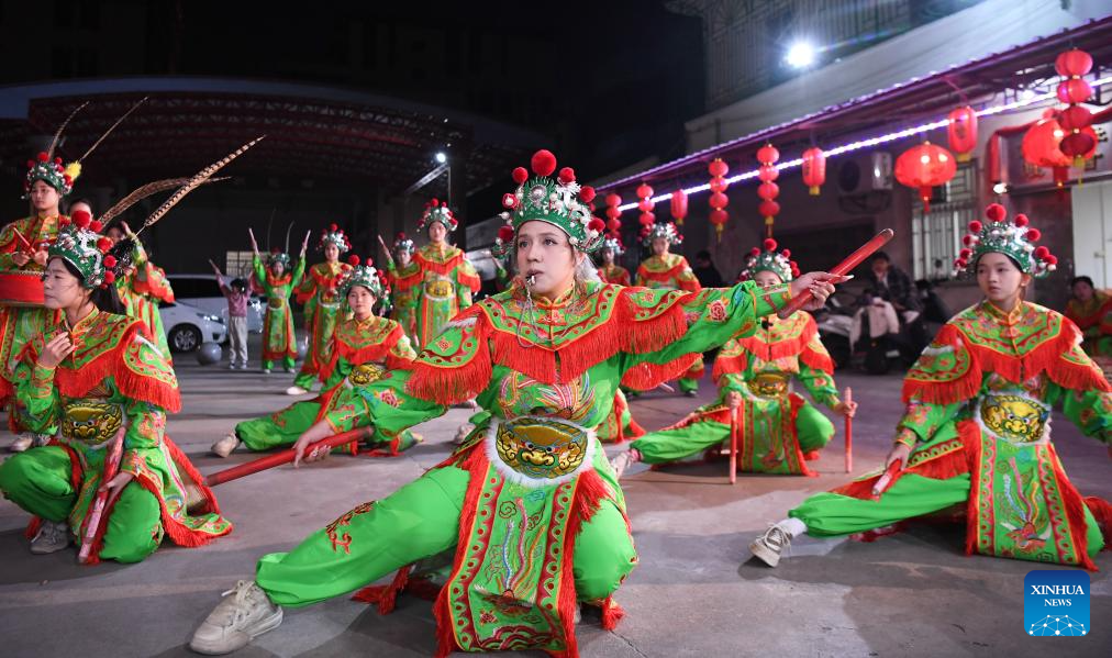 Members of an Yingge dance troupe perform during a rehearsal in Chaoyang District of Shantou City, south China's Guangdong Province, Jan. 21, 2025. Local Yingge dance troupes have been busy in rehearsing for performances to greet the upcoming Chinese New Year. The Yingge dance, or "dance to the hero's song," merges opera, dance, and martial arts. Dating back to the Ming Dynasty (1368-1644), this traditional dance is often performed during traditional Chinese festivals. The Yingge dance was listed as the first batch of national intangible cultural heritage in 2006. (Xinhua/Deng Hua)