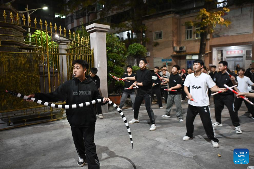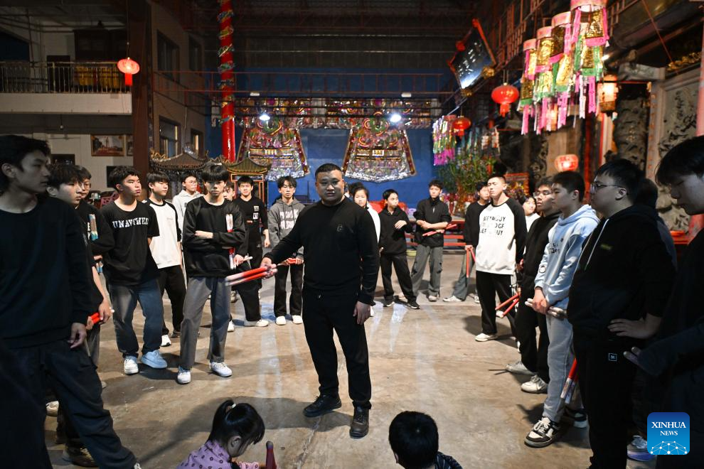 Yingge dance coach Chen Tanpeng (C) teaches students in Chaoyang District of Shantou City, south China's Guangdong Province, Jan. 21, 2025. Local Yingge dance troupes have been busy in rehearsing for performances to greet the upcoming Chinese New Year. The Yingge dance, or "dance to the hero's song," merges opera, dance, and martial arts. Dating back to the Ming Dynasty (1368-1644), this traditional dance is often performed during traditional Chinese festivals. The Yingge dance was listed as the first batch of national intangible cultural heritage in 2006. (Xinhua/Deng Hua)