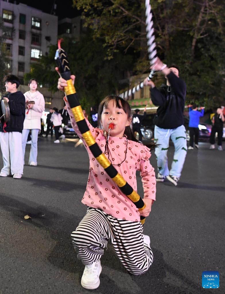 A member of an Yingge dance troupe demonstrates dance movements to a girl in Chaoyang District of Shantou City, south China's Guangdong Province, Jan. 20, 2025. Local Yingge dance troupes have been busy in rehearsing for performances to greet the upcoming Chinese New Year. The Yingge dance, or "dance to the hero's song," merges opera, dance, and martial arts. Dating back to the Ming Dynasty (1368-1644), this traditional dance is often performed during traditional Chinese festivals. The Yingge dance was listed as the first batch of national intangible cultural heritage in 2006. (Xinhua/Deng Hua)