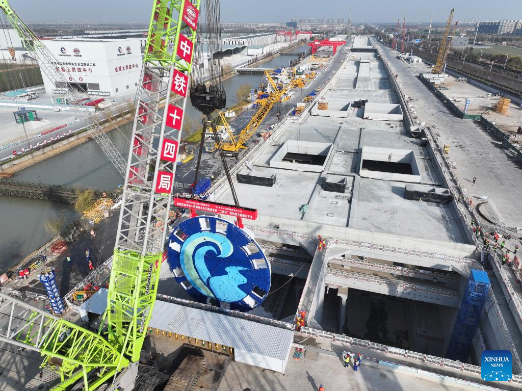 An aerial drone photo taken on Jan. 22, 2025 shows the cutter head of "Jianghaihao" shield tunneling machine during its mounting ceremony at a construction site of Haitai Yangtze River Tunnel in Nantong City, east China's Jiangsu Province. The mounting ceremony of the cutter head of "Jianghaihao" shield tunneling machine, with a diameter of 16.64 meters, was held here on Wednesday. The 39.07-km Haitai Yangtze River Tunnel links the Haimen District of Nantong City with Taicang of Suzhou City, both in Jiangsu. (Xinhua/Ji Chunpeng)