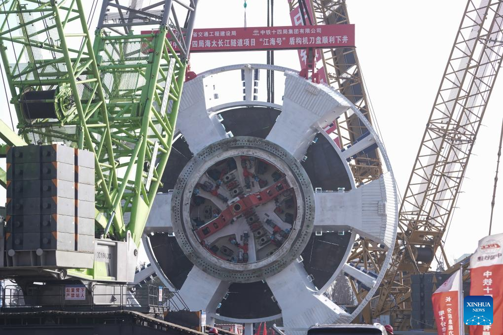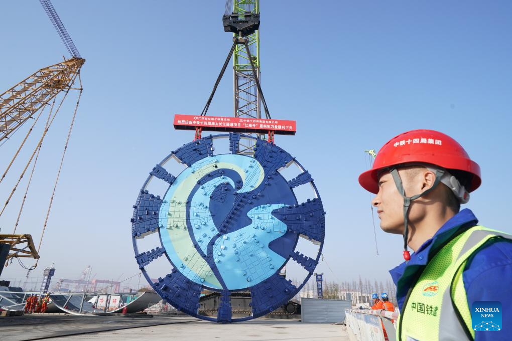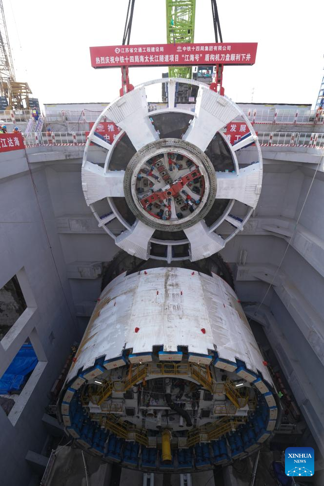 This photo taken on Jan. 22, 2025 shows the cutter head of "Jianghaihao" shield tunneling machine during its mounting ceremony at a construction site of Haitai Yangtze River Tunnel in Nantong City, east China's Jiangsu Province. The mounting ceremony of the cutter head of "Jianghaihao" shield tunneling machine, with a diameter of 16.64 meters, was held here on Wednesday. The 39.07-km Haitai Yangtze River Tunnel links the Haimen District of Nantong City with Taicang of Suzhou City, both in Jiangsu. (Xinhua/Ji Chunpeng)