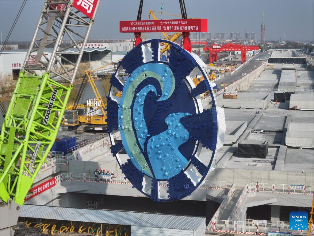This photo taken on Jan. 22, 2025 shows the cutter head of "Jianghaihao" shield tunneling machine at a construction site of Haitai Yangtze River Tunnel in Nantong City, east China's Jiangsu Province. The mounting ceremony of the cutter head of "Jianghaihao" shield tunneling machine, with a diameter of 16.64 meters, was held here on Wednesday. The 39.07-km Haitai Yangtze River Tunnel links the Haimen District of Nantong City with Taicang of Suzhou City, both in Jiangsu. (Xinhua/Yang Lei)