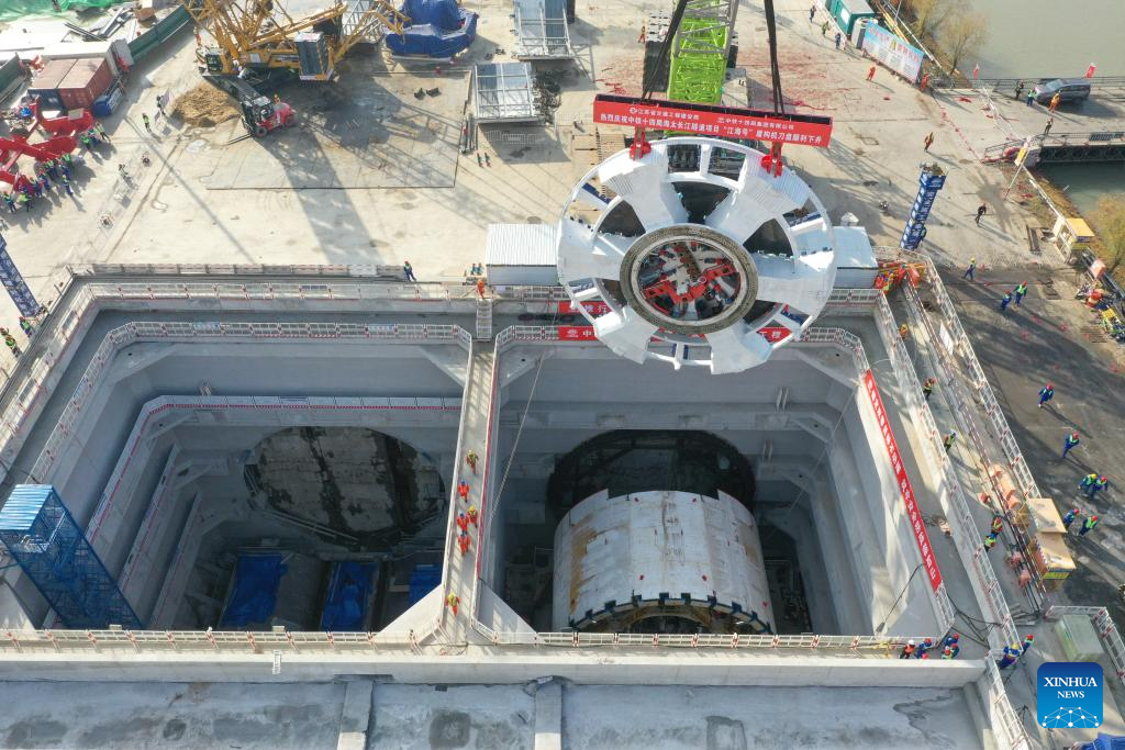 An aerial drone photo taken on Jan. 22, 2025 shows the cutter head of "Jianghaihao" shield tunneling machine being hoisted at a construction site of Haitai Yangtze River Tunnel in Nantong City, east China's Jiangsu Province. The mounting ceremony of the cutter head of "Jianghaihao" shield tunneling machine, with a diameter of 16.64 meters, was held here on Wednesday. The 39.07-km Haitai Yangtze River Tunnel links the Haimen District of Nantong City with Taicang of Suzhou City, both in Jiangsu. (Xinhua/Yang Lei)