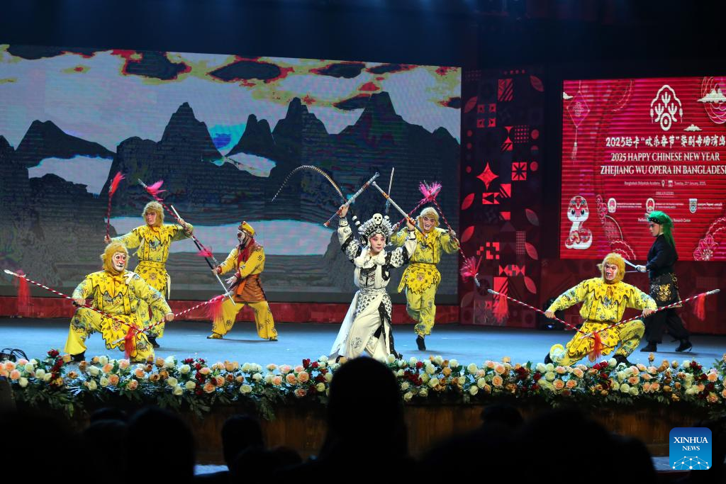 Artists perform during the "Happy Chinese New Year" Wu Opera special performance in Dhaka, capital of Bangladesh, Jan. 21, 2025. The "Happy Chinese New Year" Wu Opera special performance enchanted an audience of around 800 at the National Theater of the Bangladesh Shilpakala Academy here on Tuesday. During the event, artists from the Zhejiang Wu Opera Research Institute delivered stunning performances of Wu Opera classics such as "The Celestial Maiden Scattering Flowers" and "Monkey King Fights the White Bone Demon." (Photo by Habibur Rahman/Xinhua)
