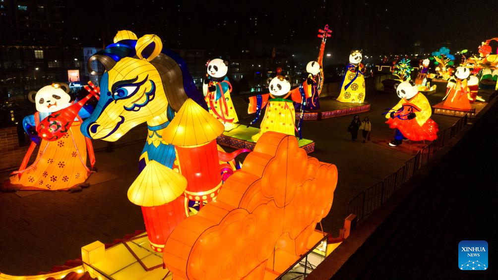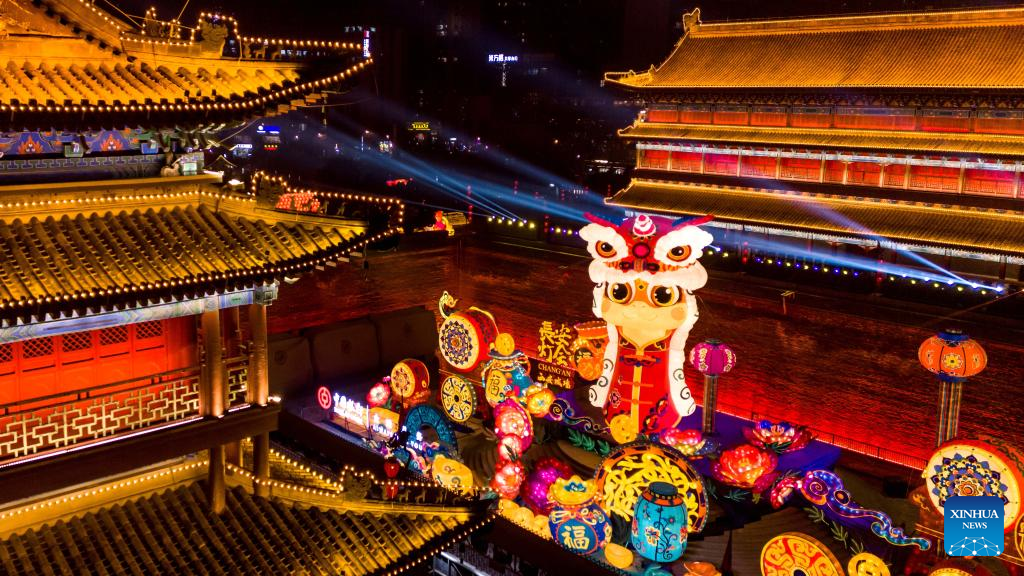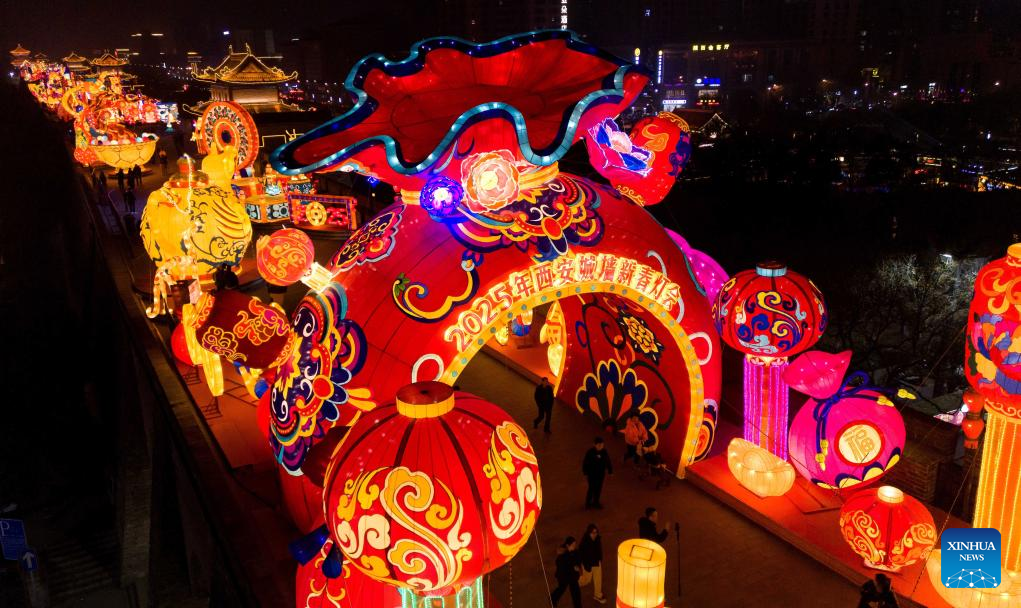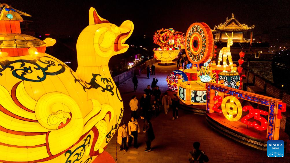 A drone photo taken on Jan. 22, 2025 shows lanterns displayed near the city wall of Xi'an during the 2025 Chang'an Lantern Festival in Xi'an, northwest China's Shaanxi Province. The 2025 Chang'an Lantern Festival officially opened here on Wednesday to mark the upcoming Chinese Lunar New Year. The event will last until March 16, showcasing light installations at landmark scenic areas such as the Xi'an City Wall, the Tang Paradise, and the Daming Palace National Heritage Park. (Xinhua/Zou Jingyi)