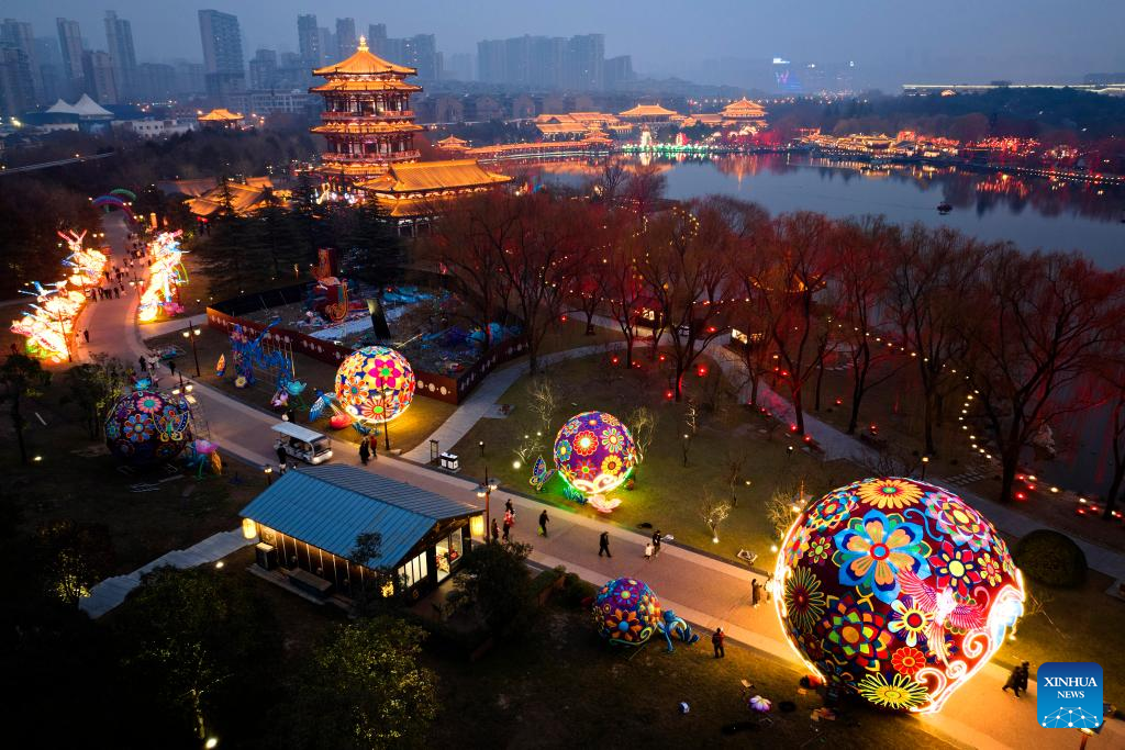 An aerial drone photo taken on Jan. 22, 2025 shows people visiting the Daming Palace National Heritage Park during the 2025 Chang'an Lantern Festival in Xi'an, northwest China's Shaanxi Province. The 2025 Chang'an Lantern Festival officially opened here on Wednesday to mark the upcoming Chinese Lunar New Year. The event will last until March 16, showcasing light installations at landmark scenic areas such as the Xi'an City Wall, the Tang Paradise, and the Daming Palace National Heritage Park. (Xinhua/Zou Jingyi)