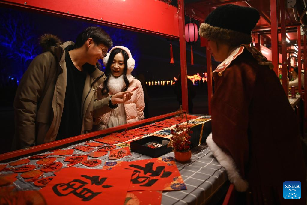 People look at cultural creative merchandise at the Daming Palace National Heritage Park during the 2025 Chang'an Lantern Festival in Xi'an, northwest China's Shaanxi Province, Jan. 22, 2025. The 2025 Chang'an Lantern Festival officially opened here on Wednesday to mark the upcoming Chinese Lunar New Year. The event will last until March 16, showcasing light installations at landmark scenic areas such as the Xi'an City Wall, the Tang Paradise, and the Daming Palace National Heritage Park. (Xinhua/Zou Jingyi)