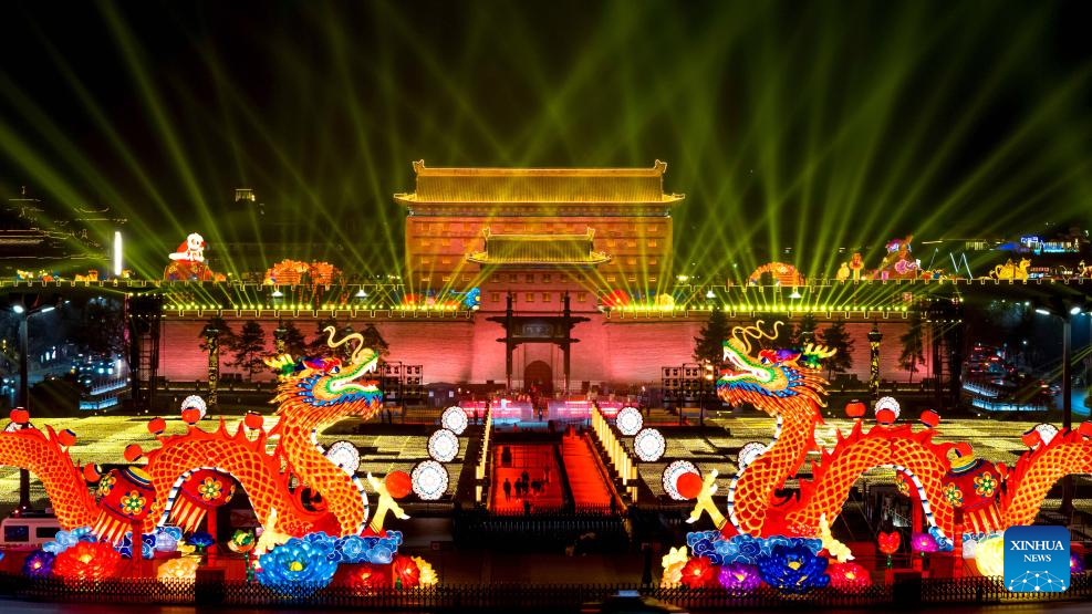 A drone photo taken on Jan. 22, 2025 shows visitors watching lanterns on the city wall of Xi'an during the 2025 Chang'an Lantern Festival in Xi'an, northwest China's Shaanxi Province. The 2025 Chang'an Lantern Festival officially opened here on Wednesday to mark the upcoming Chinese Lunar New Year. The event will last until March 16, showcasing light installations at landmark scenic areas such as the Xi'an City Wall, the Tang Paradise, and the Daming Palace National Heritage Park. (Xinhua/Zou Jingyi)