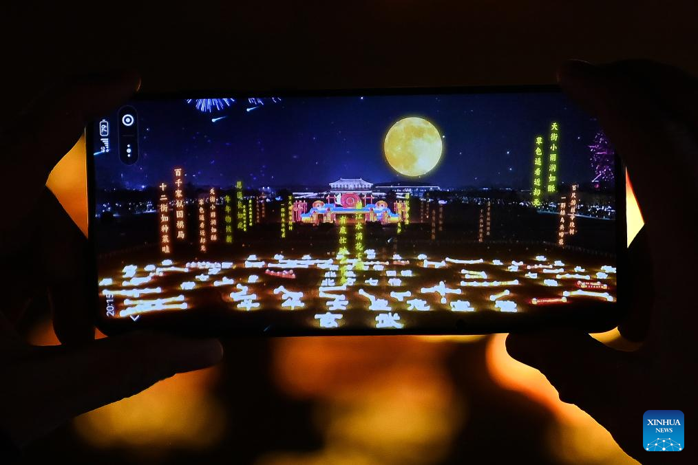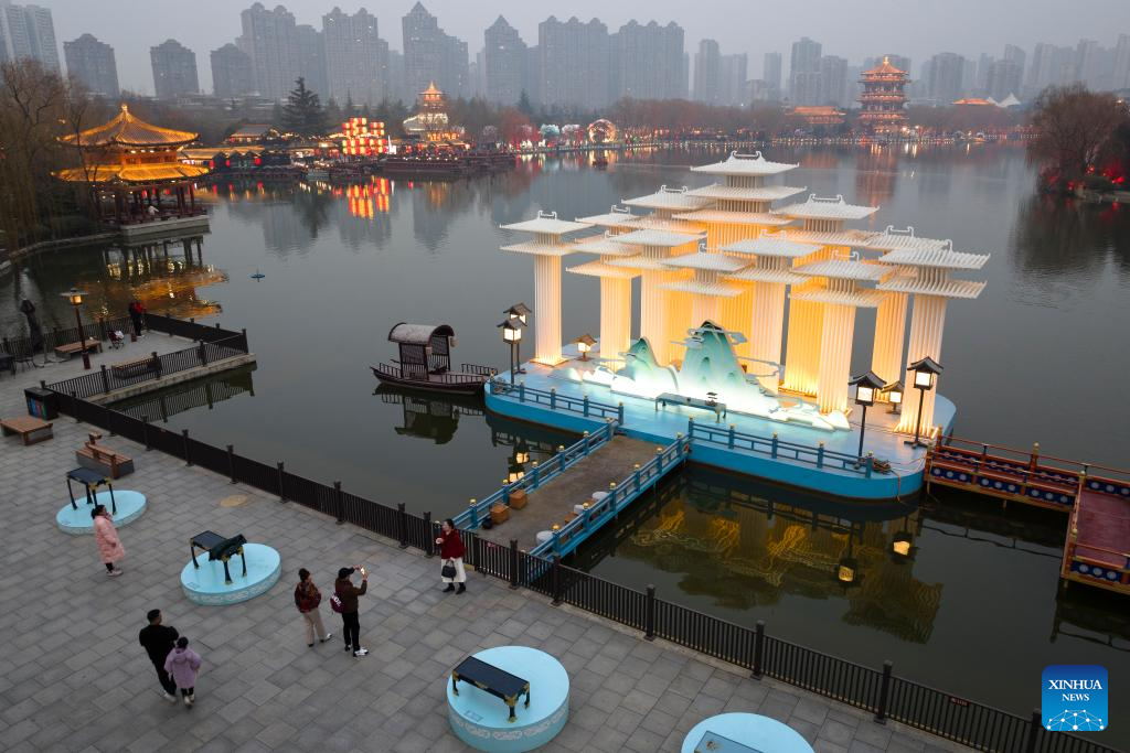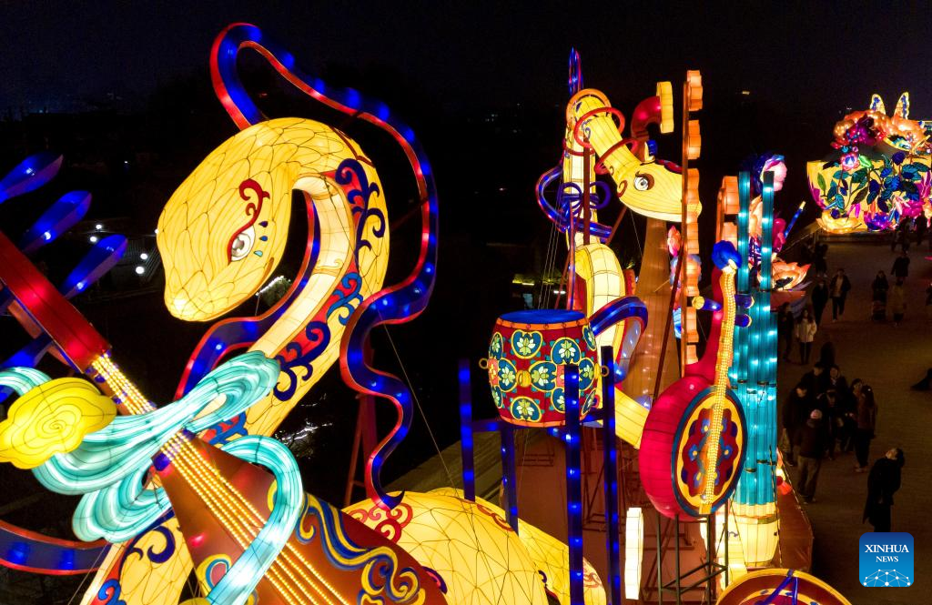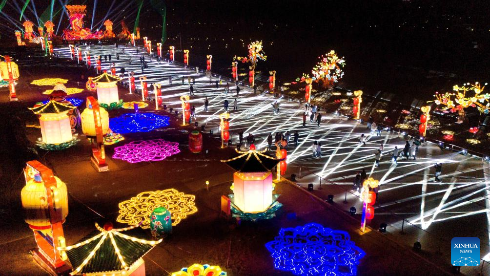 An aerial drone photo taken on Jan. 22, 2025 shows visitors taking photos of lanterns at the Tang Paradise during the 2025 Chang'an Lantern Festival in Xi'an, northwest China's Shaanxi Province. The 2025 Chang'an Lantern Festival officially opened here on Wednesday to mark the upcoming Chinese Lunar New Year. The event will last until March 16, showcasing light installations at landmark scenic areas such as the Xi'an City Wall, the Tang Paradise, and the Daming Palace National Heritage Park. (Xinhua/Shao Rui)