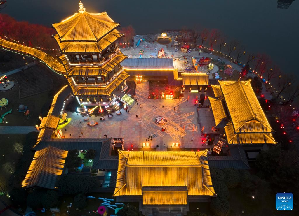 An aerial drone photo taken on Jan. 22, 2025 shows people visiting the Tang Paradise during the 2025 Chang'an Lantern Festival in Xi'an, northwest China's Shaanxi Province. The 2025 Chang'an Lantern Festival officially opened here on Wednesday to mark the upcoming Chinese Lunar New Year. The event will last until March 16, showcasing light installations at landmark scenic areas such as the Xi'an City Wall, the Tang Paradise, and the Daming Palace National Heritage Park. (Xinhua/Shao Rui)