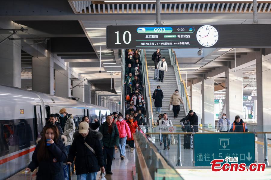 Passengers take high-speed train G3693 at Chaoyang Railway Station in Beijing, Jan. 22, 2025. (China News Service/Jia Tianyong)