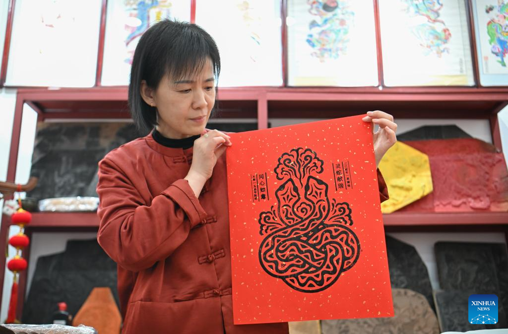 An inheritor of Yangliuqing woodblock new year picture craft shows a newly-printed new year picture themed on the Year of the Snake at a studio in Yangliuqing Town, Tianjin, north China, Jan. 20, 2025.