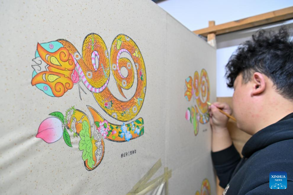 An artist paints a new year picture at a picture shop in Yangliuqing Town, Tianjin, north China, Jan. 20, 2025.