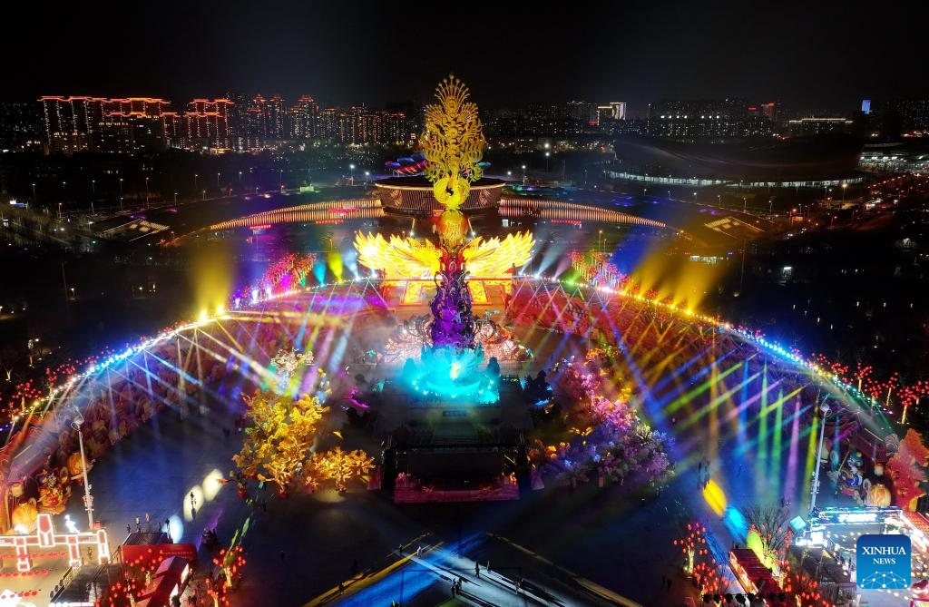 An aerial drone photo taken on Jan. 22, 2025 shows people visiting the a Spring Festival lantern fair in Tangshan, north China's Hebei Province. The 2025 Tangshan Nanhu Spring Festival lantern fair opened here on Wednesday, which will last until March 1. (Xinhua/Yang Shiyao)