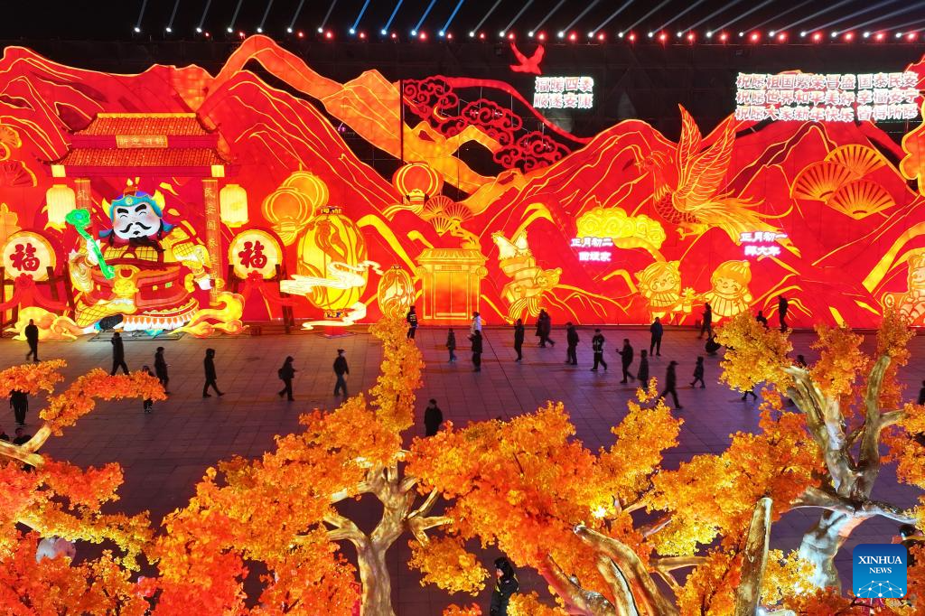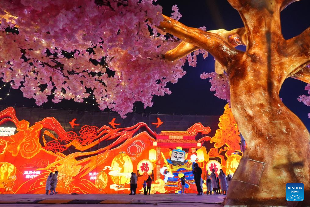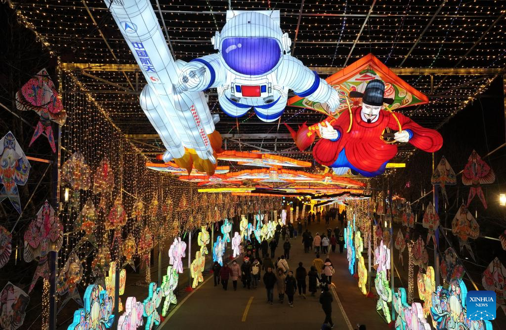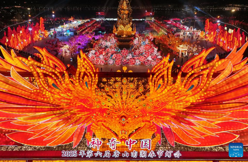 This photo taken on Jan. 22, 2025 shows people visiting the Tangshan Nanhu Spring Festival lantern fair in Tangshan, north China's Hebei Province. The 2025 Tangshan Nanhu Spring Festival lantern fair opened here on Wednesday, which will last until March 1. (Xinhua/Yang Shiyao)