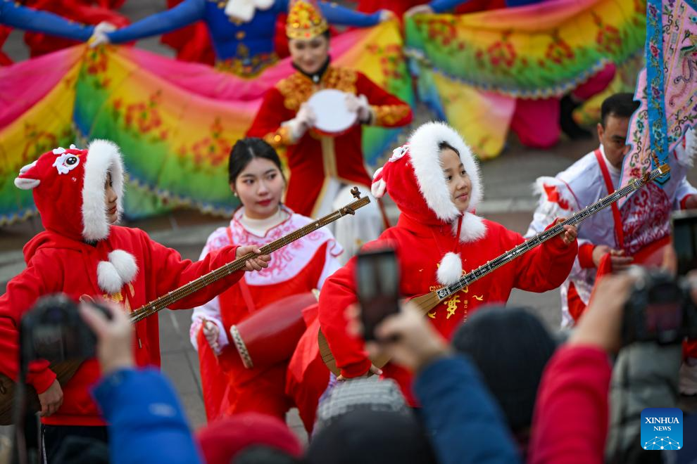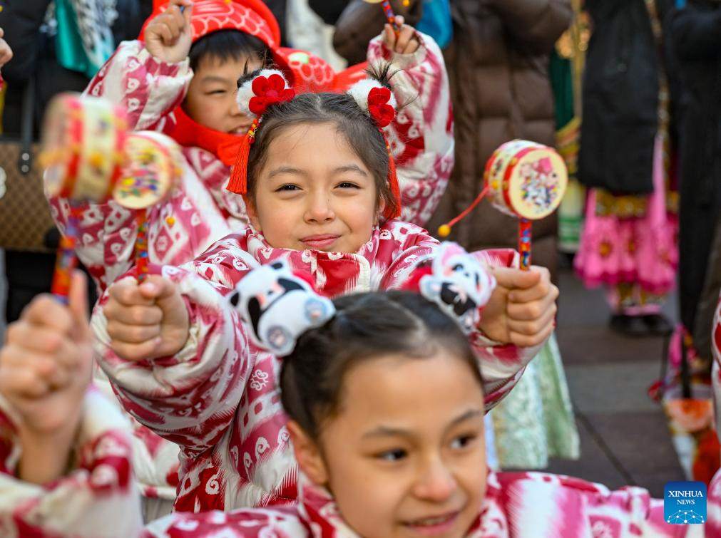 Children play the local string musical instrument dutar during a Shehuo gala at the International Grand Bazaar in Urumqi, northwest China's Xinjiang Uygur Autonomous Region, Jan. 22, 2025. The gala, which was attended by 12 performing teams made up of about 1,000 members, featured various shows of Shehuo, a type of traditional Chinese folk art form. (Xinhua/Chen Shuo)
