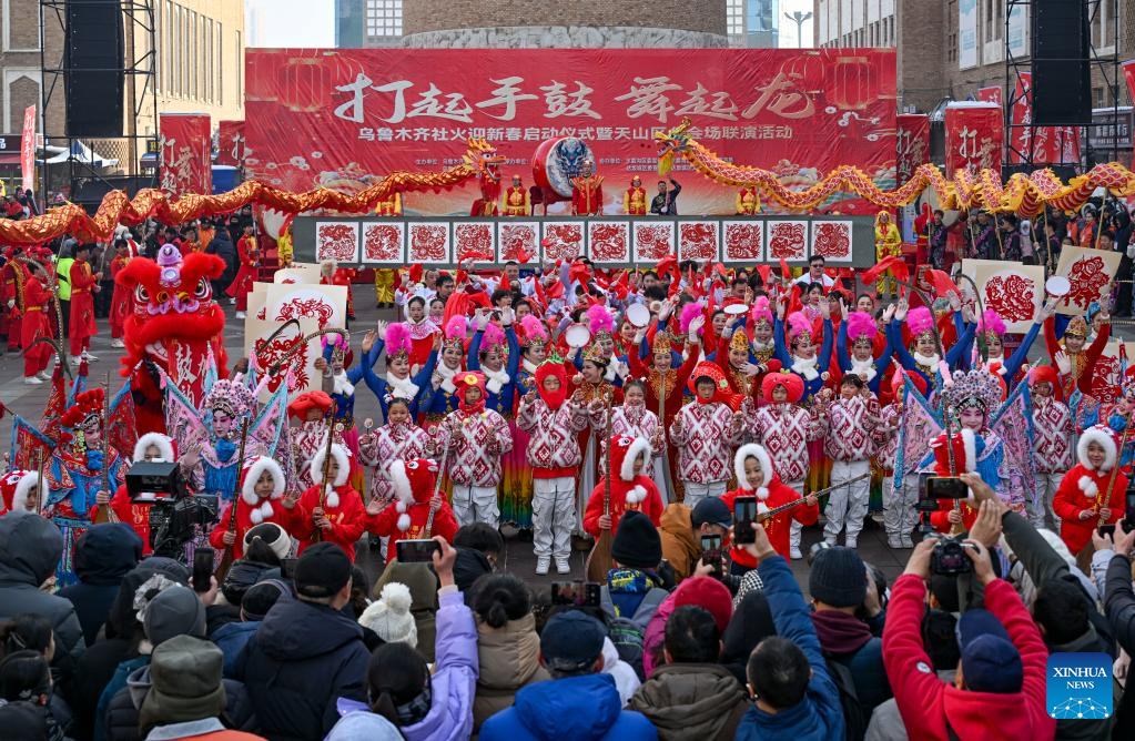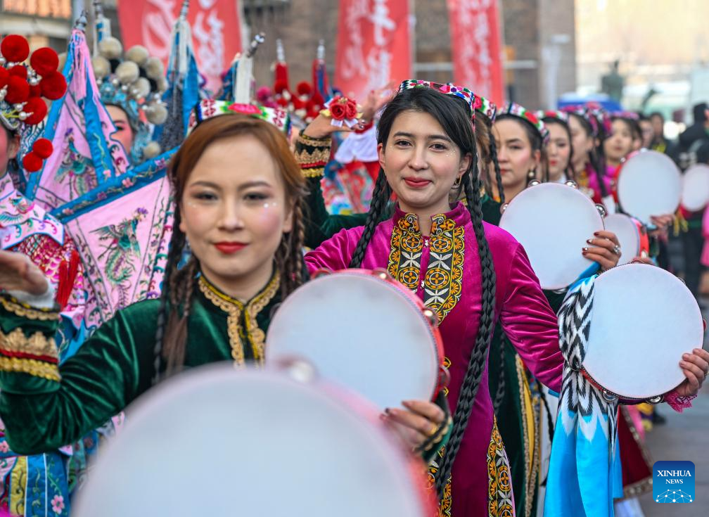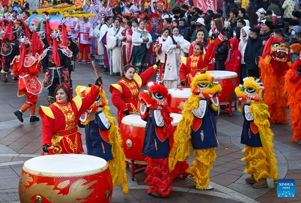 People perform during a Shehuo gala at the International Grand Bazaar in Urumqi, northwest China's Xinjiang Uygur Autonomous Region, Jan. 22, 2025. The gala, which was attended by 12 performing teams made up of about 1,000 members, featured various shows of Shehuo, a type of traditional Chinese folk art form. (Xinhua/Chen Shuo)