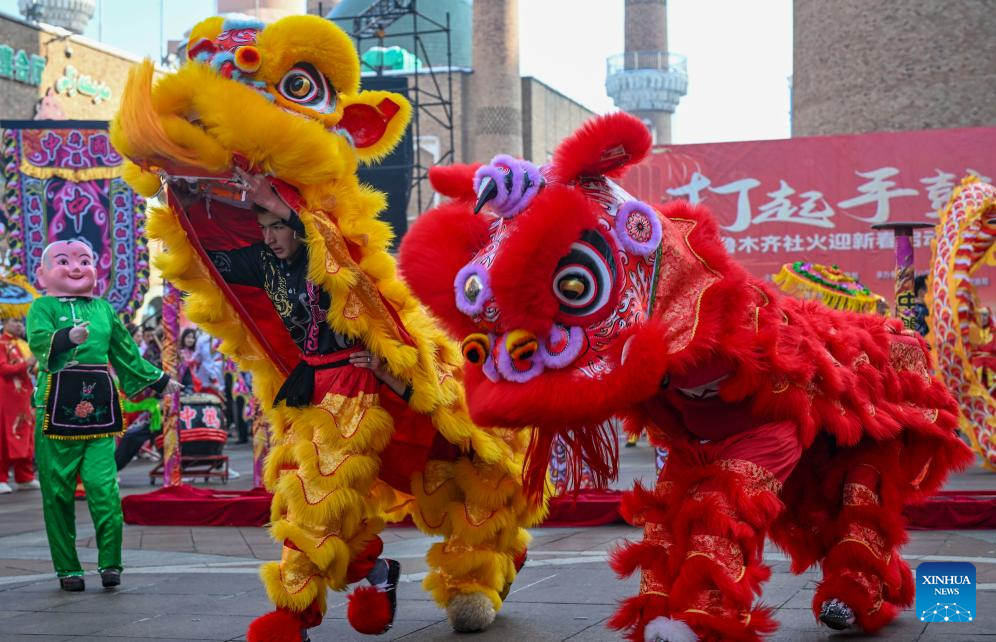 People perform a lion dance during a Shehuo gala at the International Grand Bazaar in Urumqi, northwest China's Xinjiang Uygur Autonomous Region, Jan. 22, 2025. The gala, which was attended by 12 performing teams made up of about 1,000 members, featured various shows of Shehuo, a type of traditional Chinese folk art form. (Xinhua/Chen Shuo)