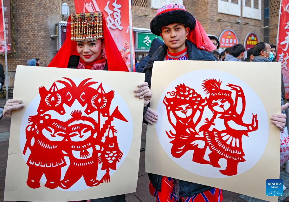 People display papercutting works during a Shehuo gala at the International Grand Bazaar in Urumqi, northwest China's Xinjiang Uygur Autonomous Region, Jan. 22, 2025. The gala, which was attended by 12 performing teams made up of about 1,000 members, featured various shows of Shehuo, a type of traditional Chinese folk art form. (Xinhua/Chen Shuo)