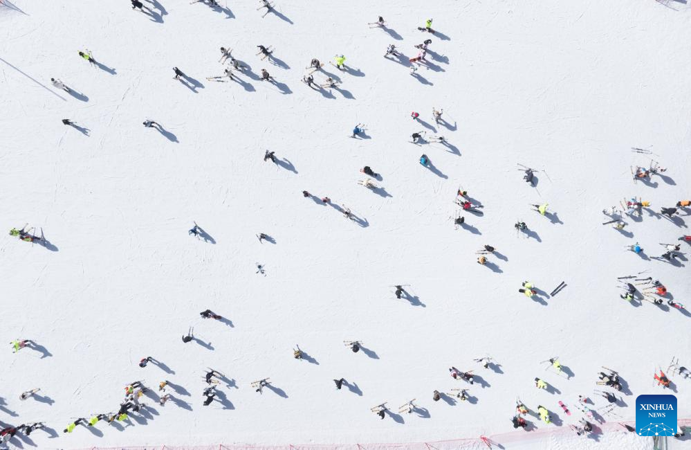 An aerial drone photo taken on Jan. 18, 2025 shows tourists skiing at Taiziling Ski Resort in Maoxian County, southwest China's Sichuan Province.