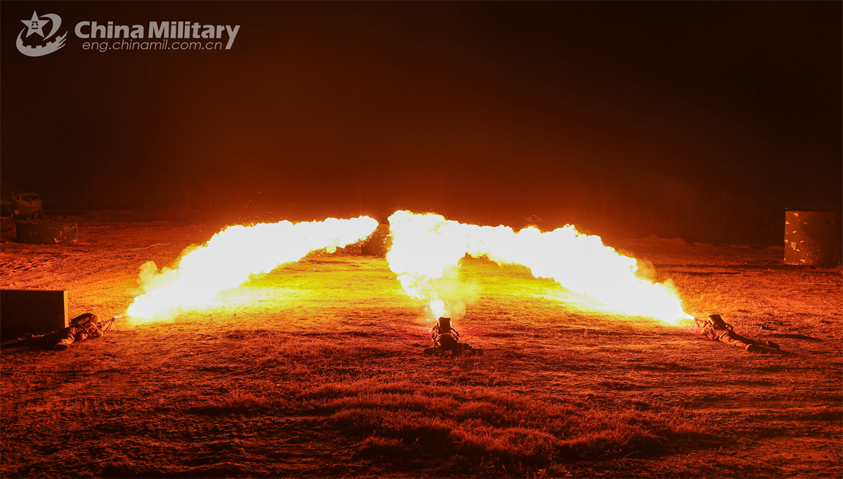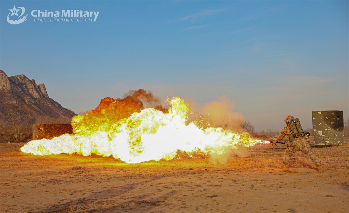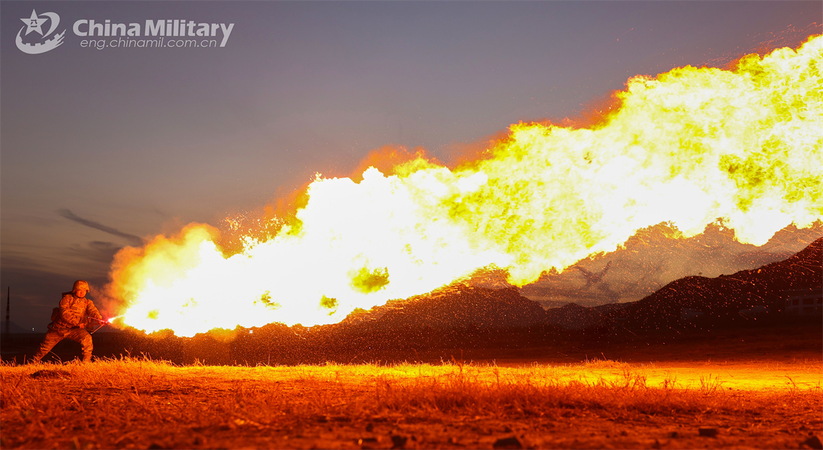A soldier assigned to a combined-arms brigade under the Chinese PLA 82nd Group Army shoots with a flamethrower to burn down target during a live-fire training exercise on December 9, 2024. (eng.chinamil.com.cn/Photo by Chen Tianjin)