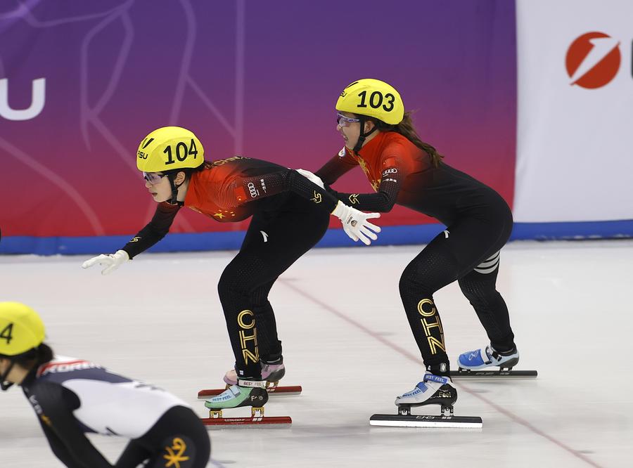Song Yifei (R) and Xing Ailin of Team China compete in the women's 3000m relay final A of the short track speed skating competition at the 2025 FISU Winter World University Games in Turin, Italy, on Jan. 23, 2025. (Xinhua/Ding Xu)