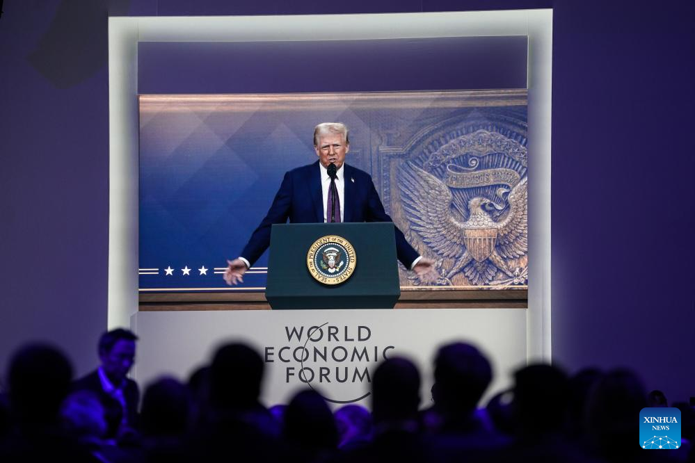 People watch virtual remarks of U.S. President Donald Trump at the World Economic Forum (WEF) Annual Meeting in Davos, Switzerland, Jan. 23, 2025. In his message to global business leaders, Trump promised what would be "among the lowest taxes of any nation on Earth" for those who bring manufacturing operations to the United States, but still warned of tariffs for those who do not. (Xinhua/Peng Ziyang)