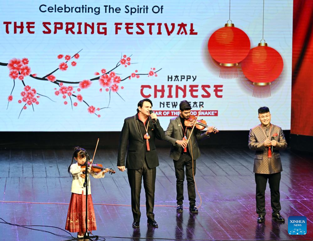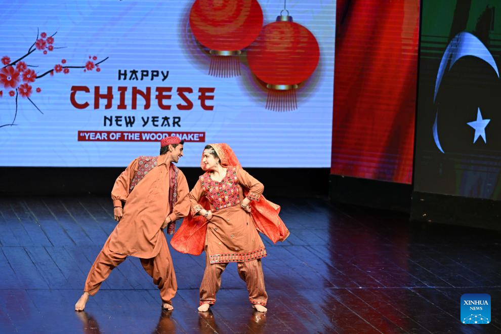 Pakistani artists perform during an event to celebrate the upcoming Chinese New Year in Islamabad, capital of Pakistan, on Jan. 22, 2025. The event features vibrant traditional dances by both Chinese and Pakistani performers, showcasing the rich cultural heritage of the two nations. (Xinhua/Ahmad Kamal)