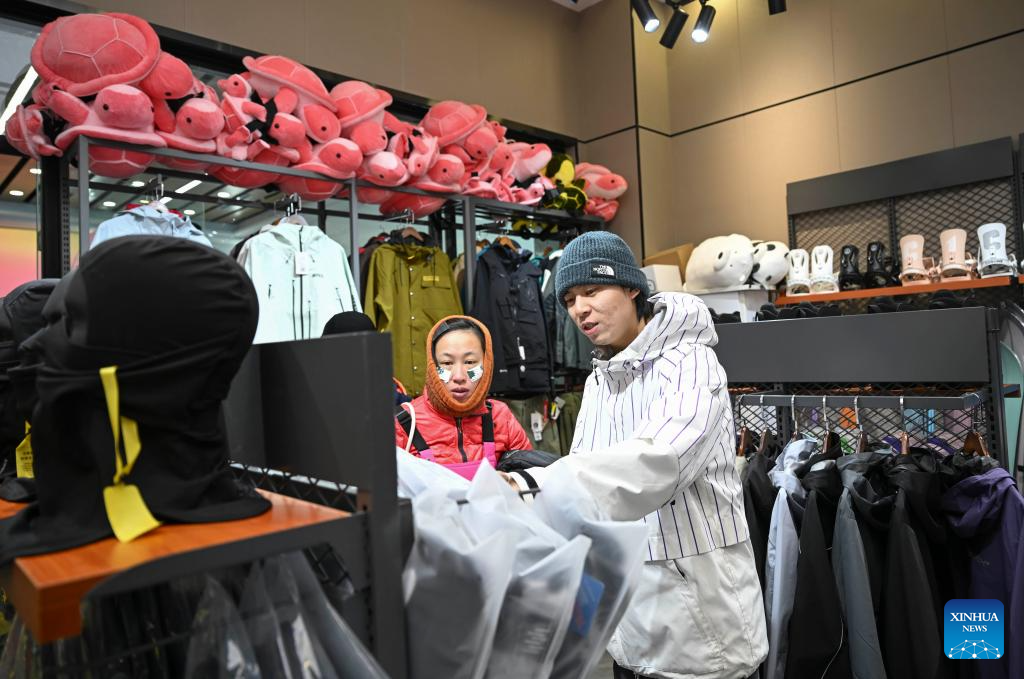 Tourists select ski equipment at a shop at Jiangjunshan Ski Resort in Altay, northwest China's Xinjiang Uygur Autonomous Region, Jan. 24, 2025. (Xinhua/Hu Huhu)