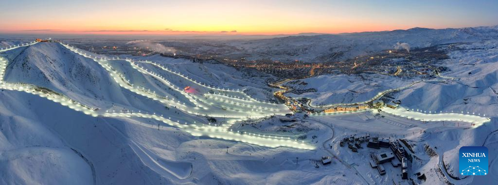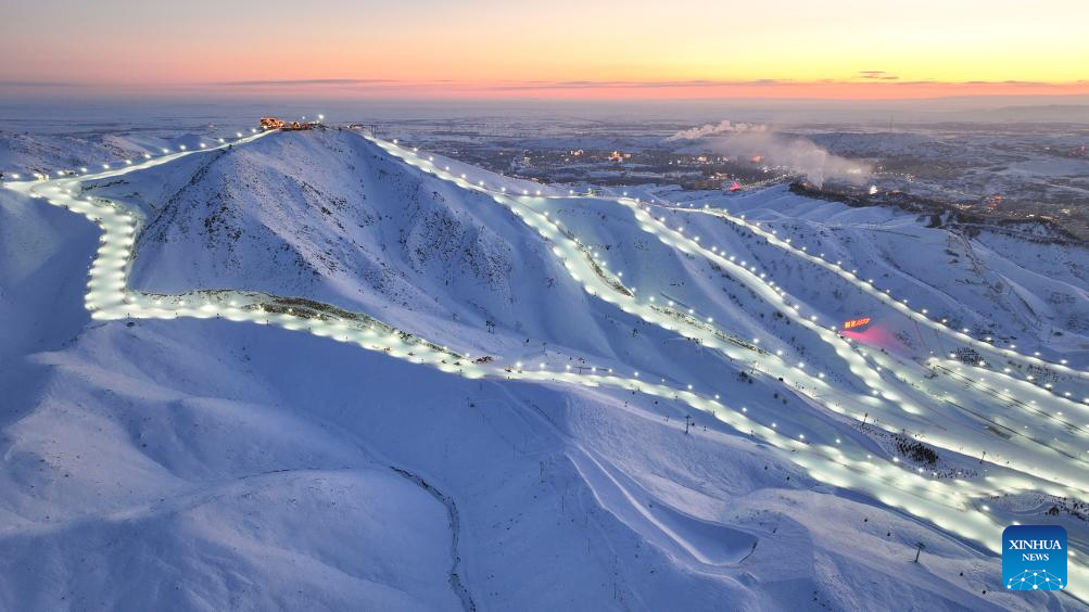 An aerial drone photo shows a view of Jiangjunshan Ski Resort at dusk in Altay, northwest China's Xinjiang Uygur Autonomous Region, Jan. 24, 2025. The resort opens several pistes at night to meet the diverse needs of tourists. (Xinhua/Hu Huhu)