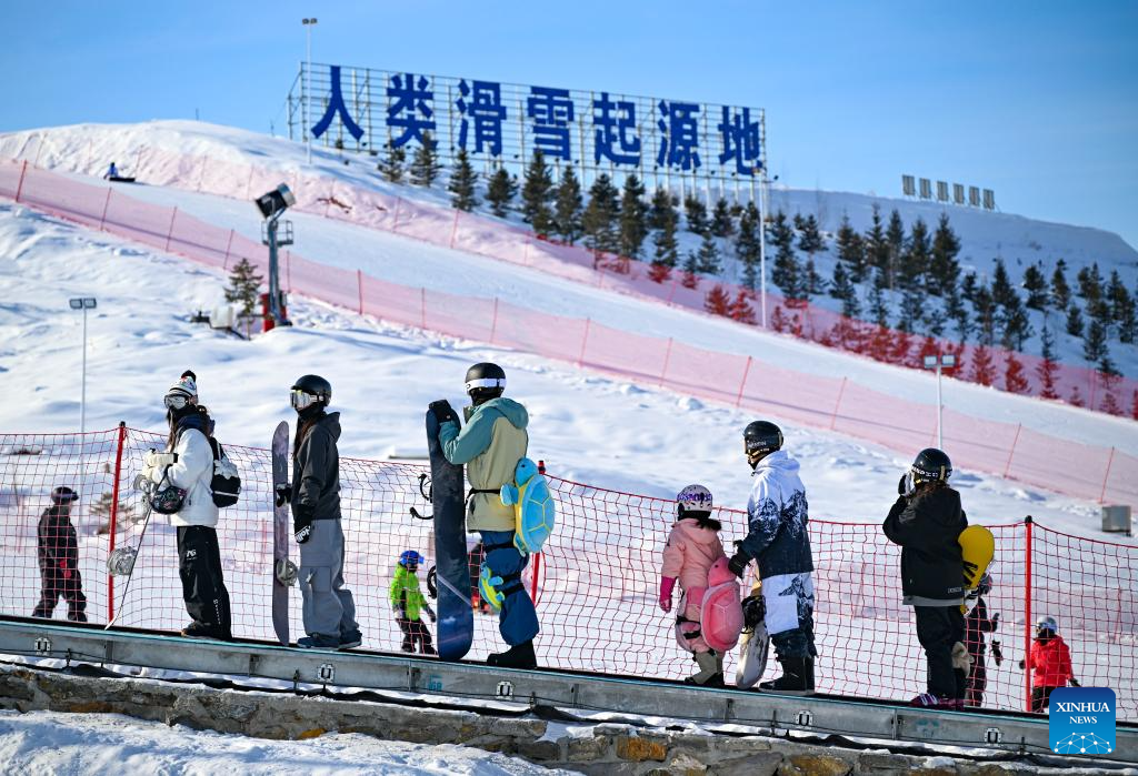 Tourists take a magic carpet lift at Jiangjunshan Ski Resort in Altay, northwest China's Xinjiang Uygur Autonomous Region, Jan. 25, 2025. (Xinhua/Chen Shuo)