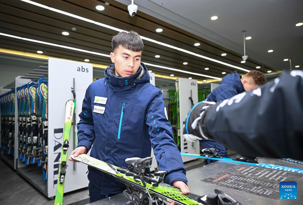 A staff member arranges ski boards at Jiangjunshan Ski Resort in Altay, northwest China's Xinjiang Uygur Autonomous Region, Jan. 24, 2025. (Xinhua/Hu Huhu)
