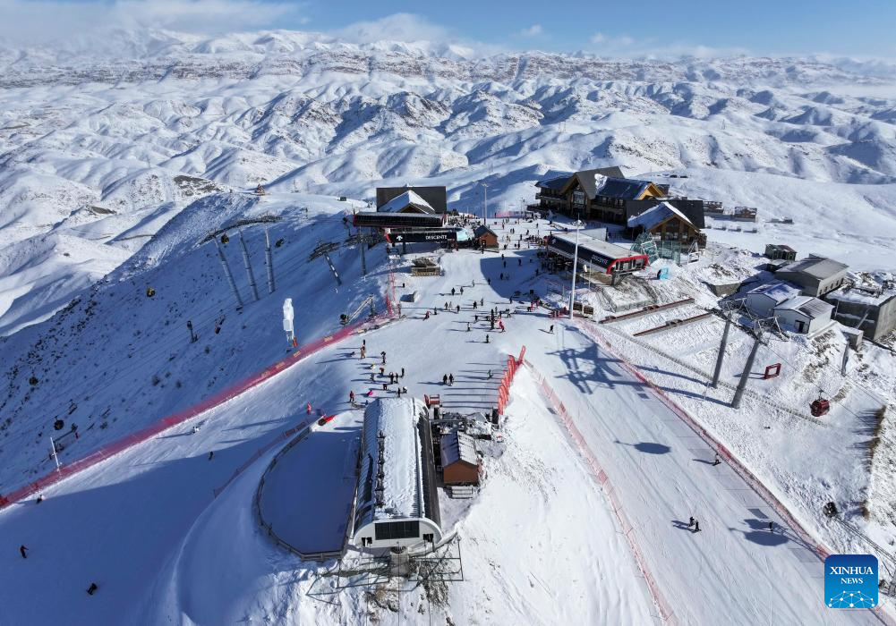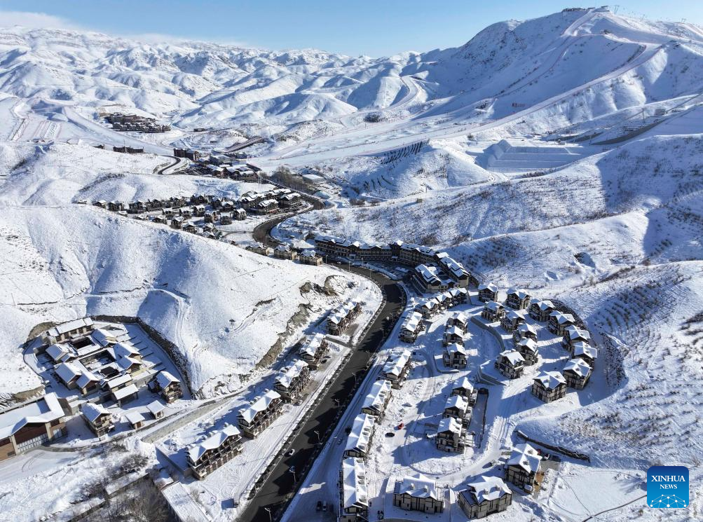 An aerial drone photo shows a view of Jiangjunshan Ski Resort in Altay, northwest China's Xinjiang Uygur Autonomous Region, Jan. 24, 2025. (Xinhua/Hu Huhu)