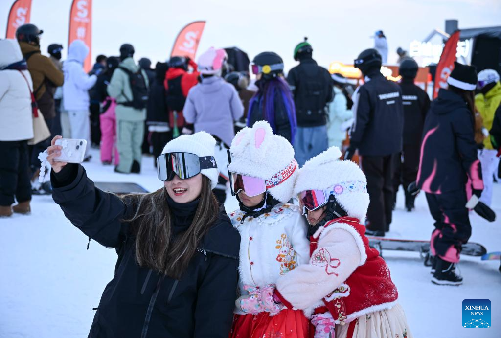 Tourists take a selfie at Jiangjunshan Ski Resort in Altay, northwest China's Xinjiang Uygur Autonomous Region, Jan. 21, 2025. (Xinhua/Hu Huhu)