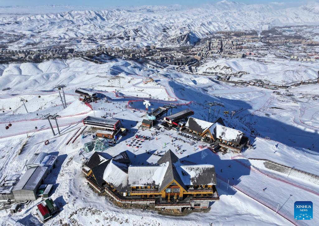 An aerial drone photo shows a view of Jiangjunshan Ski Resort and the city in Altay, northwest China's Xinjiang Uygur Autonomous Region, Jan. 24, 2025. (Xinhua/Hu Huhu)