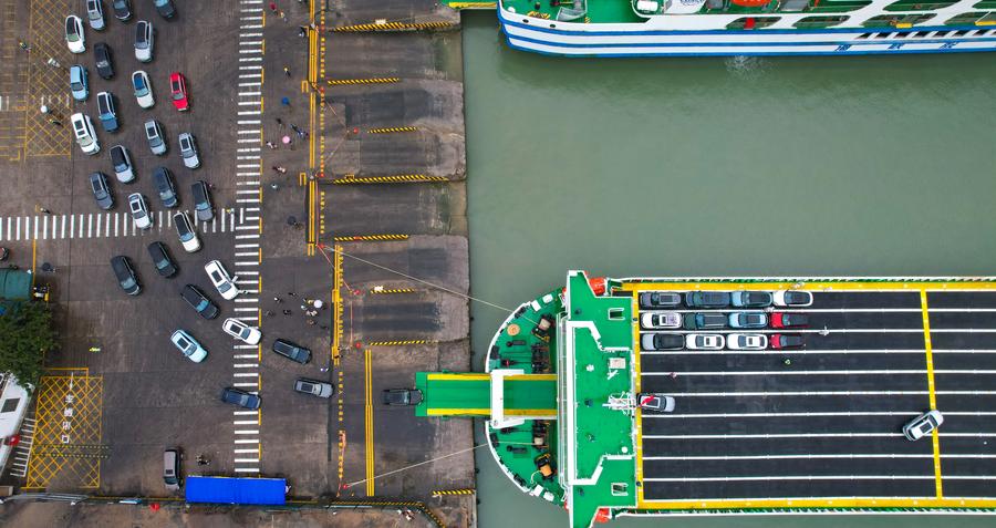 An aerial drone photo shows cars driving onto a ro-ro ship for new energy vehicles at Xiuying Port in Haikou, south China's Hainan Province, on Jan. 14, 2025. (Xinhua/Yang Guanyu)