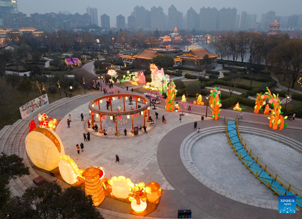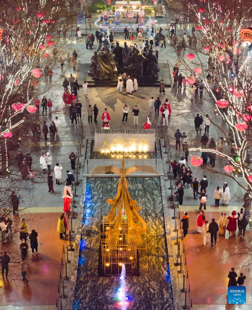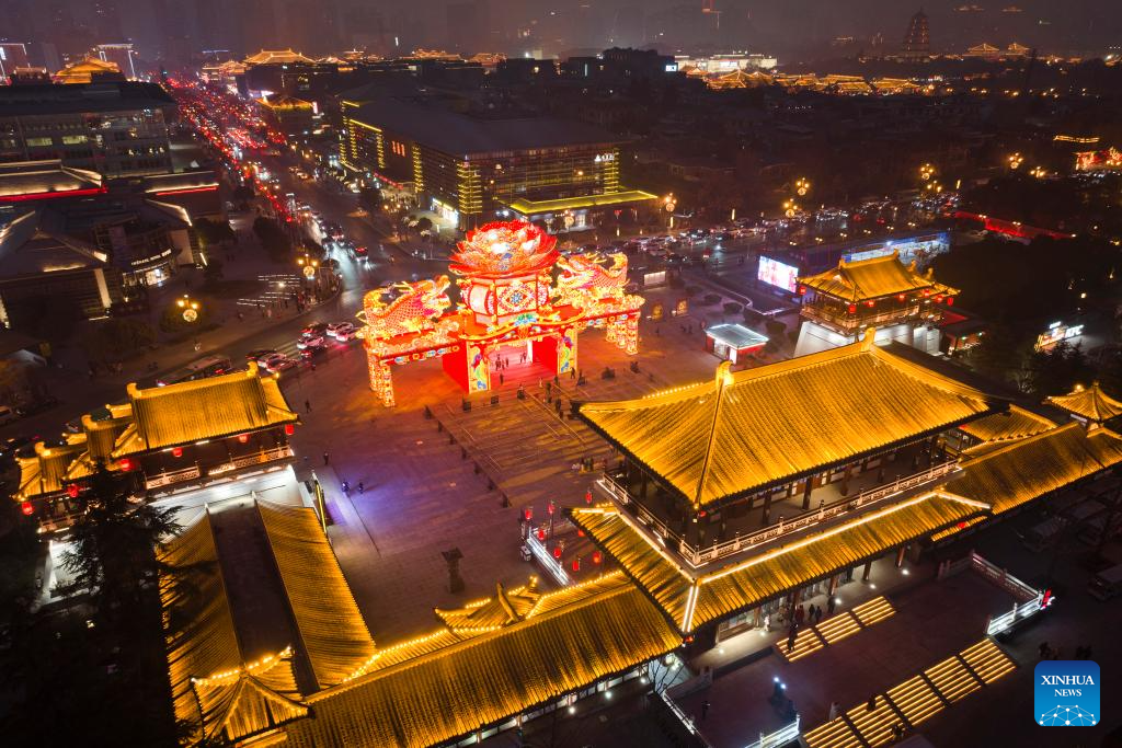 An aerial drone photo shows people visiting the Datang Everbright City scenic area in Xi'an, northwest China's Shaanxi Province, Jan. 22, 2025. As the Spring Festival approaches, Xi'an, one of the ancient capitals in Chinese history, is brimming with bright lights and splendid festive atmosphere. (Xinhua/Shao Rui)