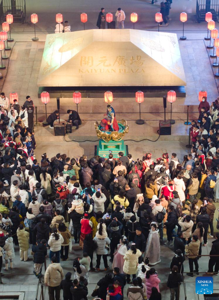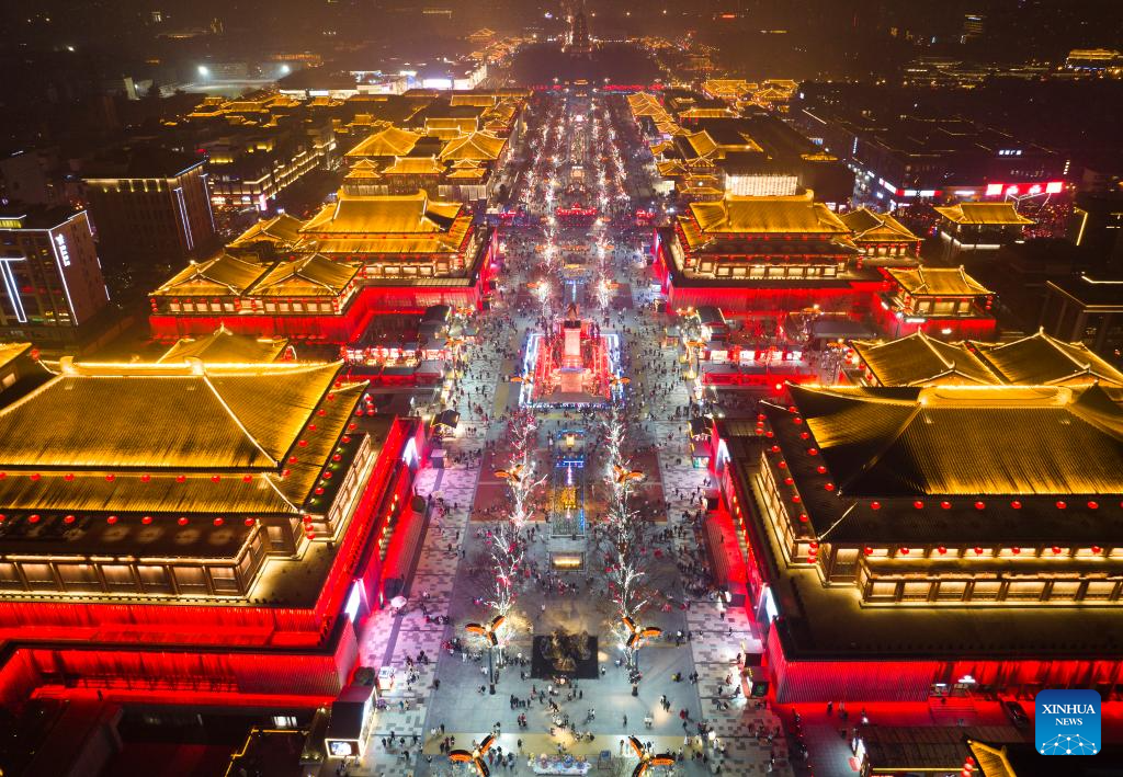 A drone photo shows visitors watching a performance at the Datang Everbright City scenic area in Xi'an, northwest China's Shaanxi Province, Jan. 22, 2025. As the Spring Festival approaches, Xi'an, one of the ancient capitals in Chinese history, is brimming with bright lights and splendid festive atmosphere. (Xinhua/Shao Rui)