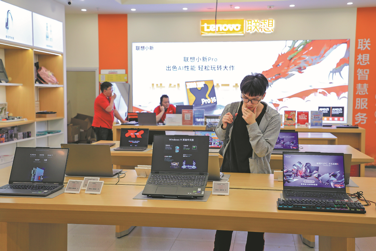 A consumer checks out Lenovo laptops in Shanghai in May. (Photo/China Daily)