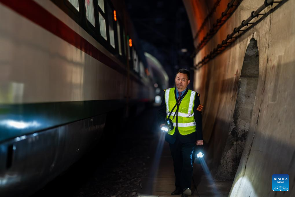 Li Yanlin walks past a passenger train that temporarily stops on its way when he patrols the rail line near the Zhugecheng Railway Station in Dali Bai Autonomous Prefecture of southwest China's Yunnan Province, Jan. 20, 2025. Zhugecheng Railway Station is a small crossing station on the railway connecting Dali and Lijiang cities in southwest China's Yunnan Province. Li Yanlin, who is 50, has worked as a station watchman here for 15 years. (Xinhua/Hu Chao)