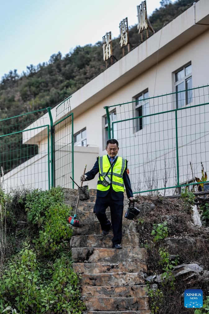 Li Yanlin prepares to clean the rails and check equipment at the Zhugecheng Railway Station in Dali Bai Autonomous Prefecture of southwest China's Yunnan Province, Jan. 21, 2025. Zhugecheng Railway Station is a small crossing station on the railway connecting Dali and Lijiang cities in southwest China's Yunnan Province. Li Yanlin, who is 50, has worked as a station watchman here for 15 years. (Xinhua/Hu Chao)