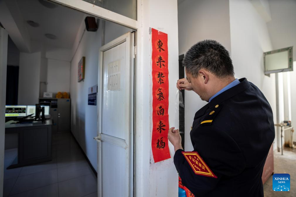 Li Yanlin pastes Spring Festival couplets at the Zhugecheng Railway Station in Dali Bai Autonomous Prefecture of southwest China's Yunnan Province, Jan. 21, 2025. Zhugecheng Railway Station is a small crossing station on the railway connecting Dali and Lijiang cities in southwest China's Yunnan Province. Li Yanlin, who is 50, has worked as a station watchman here for 15 years. (Xinhua/Hu Chao)