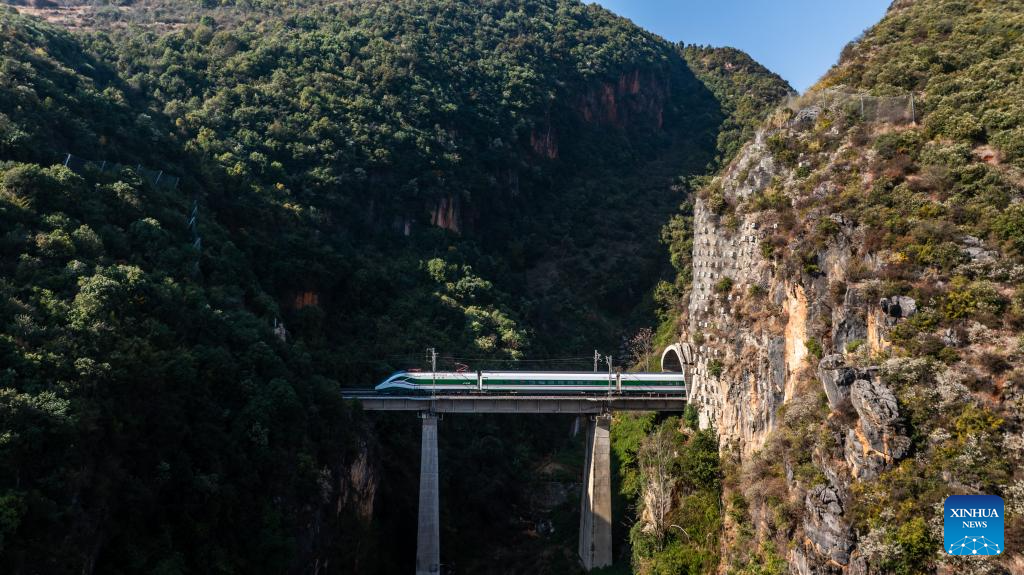 A drone photo taken on Jan. 21, 2025 shows a train running on a railway bridge near the Zhugecheng Railway Station in Dali Bai Autonomous Prefecture of southwest China's Yunnan Province. Zhugecheng Railway Station is a small crossing station on the railway connecting Dali and Lijiang cities in southwest China's Yunnan Province. Li Yanlin, who is 50, has worked as a station watchman here for 15 years. (Xinhua/Hu Chao)