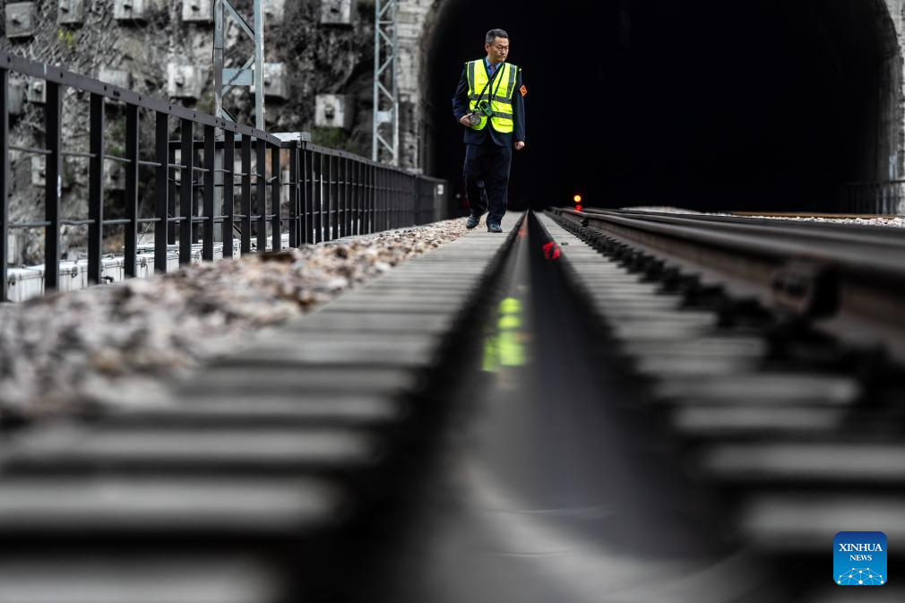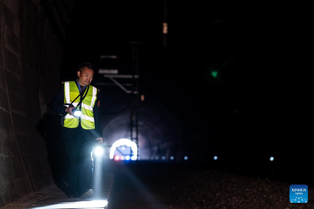 Li Yanlin patrols along the rail line near the Zhugecheng Railway Station in Dali Bai Autonomous Prefecture of southwest China's Yunnan Province, Jan. 20, 2025. (Xinhua/Hu Chao)
