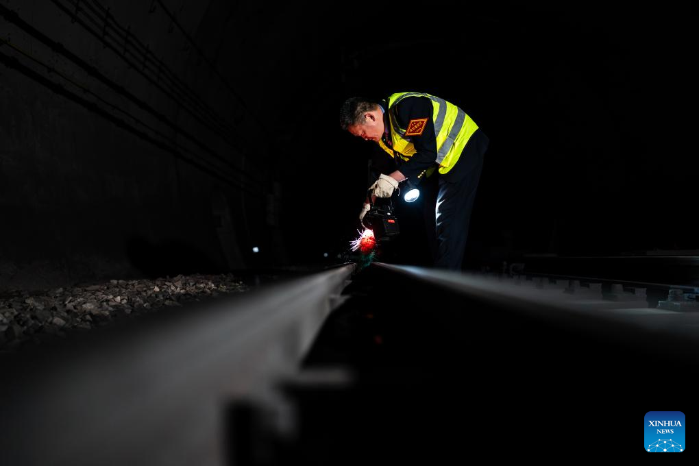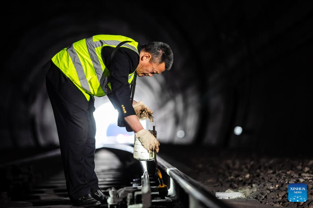 Li Yanlin applies lubricant on the rails near the Zhugecheng Railway Station in Dali Bai Autonomous Prefecture of southwest China's Yunnan Province, Jan. 21, 2025. Zhugecheng Railway Station is a small crossing station on the railway connecting Dali and Lijiang cities in southwest China's Yunnan Province. Li Yanlin, who is 50, has worked as a station watchman here for 15 years. (Xinhua/Hu Chao)