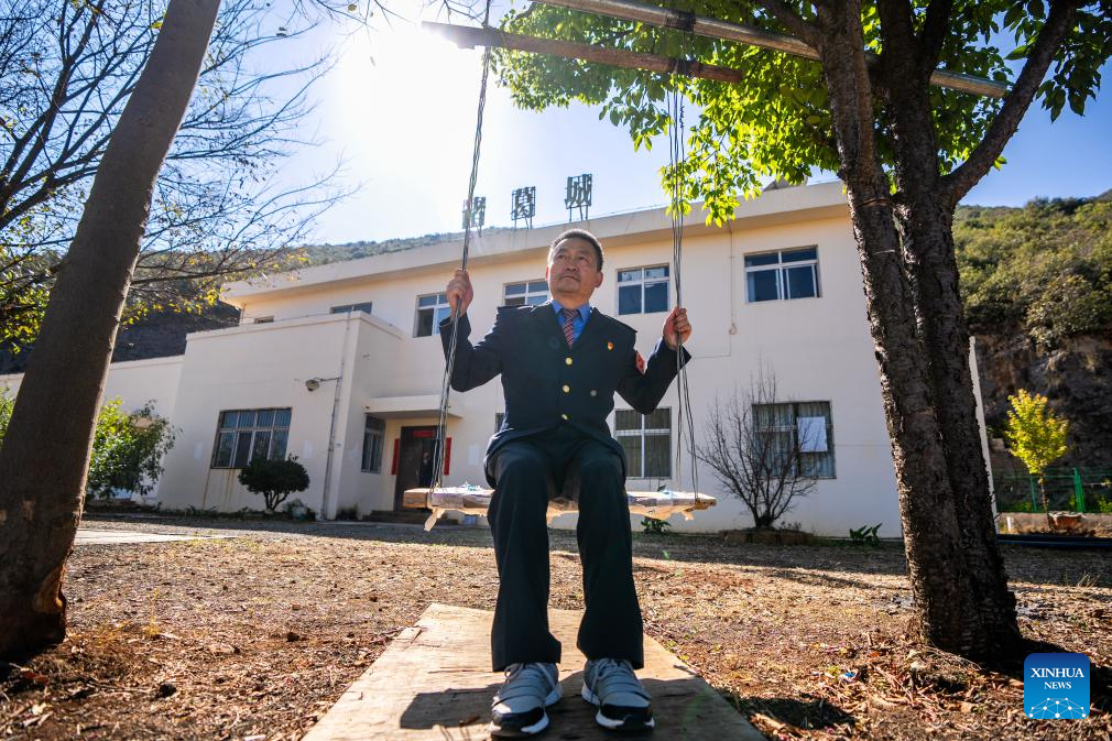 Li Yanlin rests on a swing in front of the Zhugecheng Railway Station in Dali Bai Autonomous Prefecture of southwest China's Yunnan Province, Jan. 21, 2025. Zhugecheng Railway Station is a small crossing station on the railway connecting Dali and Lijiang cities in southwest China's Yunnan Province. Li Yanlin, who is 50, has worked as a station watchman here for 15 years. (Xinhua/Hu Chao)