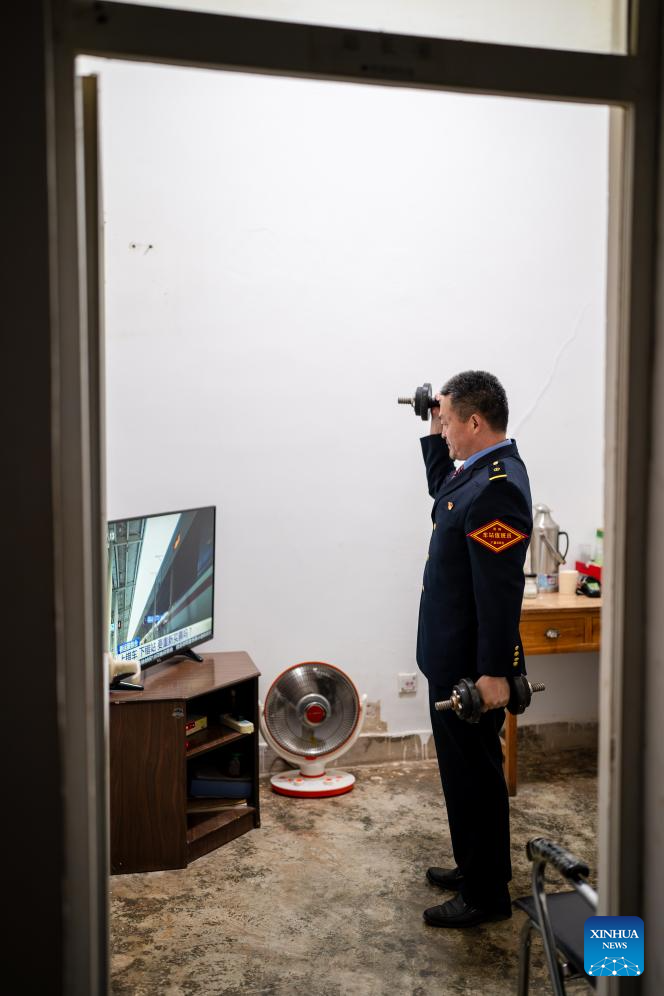 Li Yanlin does exercises while watching TV at the Zhugecheng Railway Station in Dali Bai Autonomous Prefecture of southwest China's Yunnan Province, Jan. 20, 2025. Zhugecheng Railway Station is a small crossing station on the railway connecting Dali and Lijiang cities in southwest China's Yunnan Province. Li Yanlin, who is 50, has worked as a station watchman here for 15 years. (Xinhua/Hu Chao)