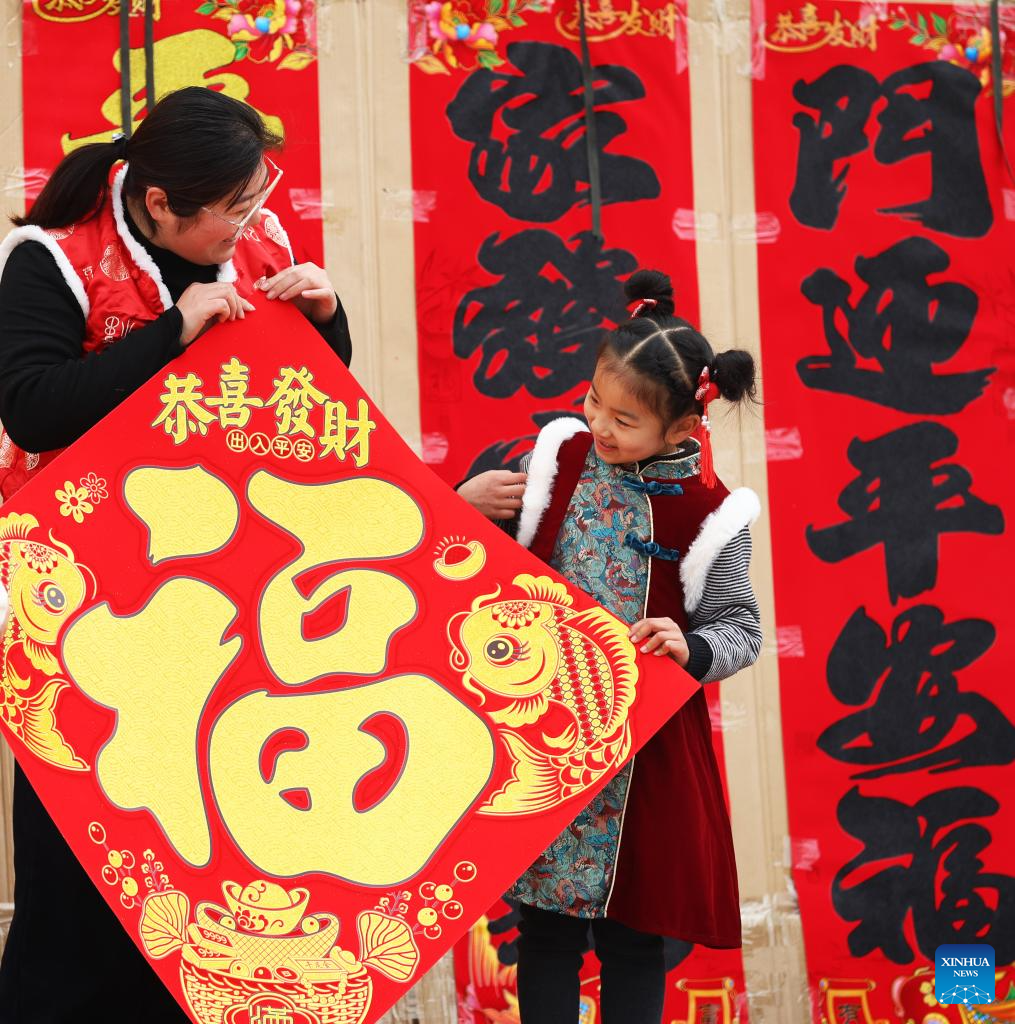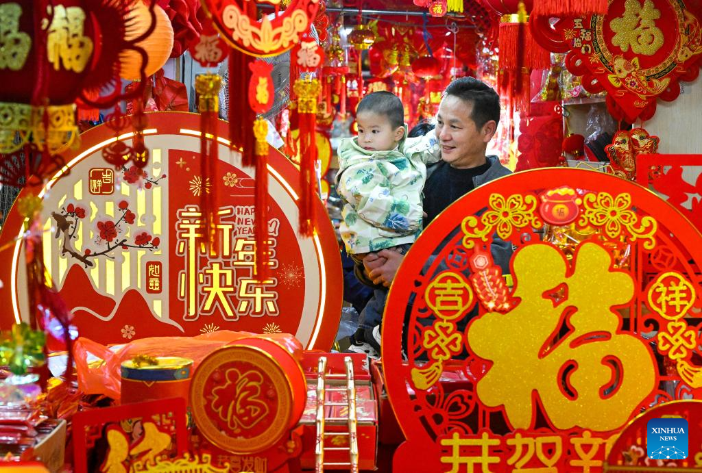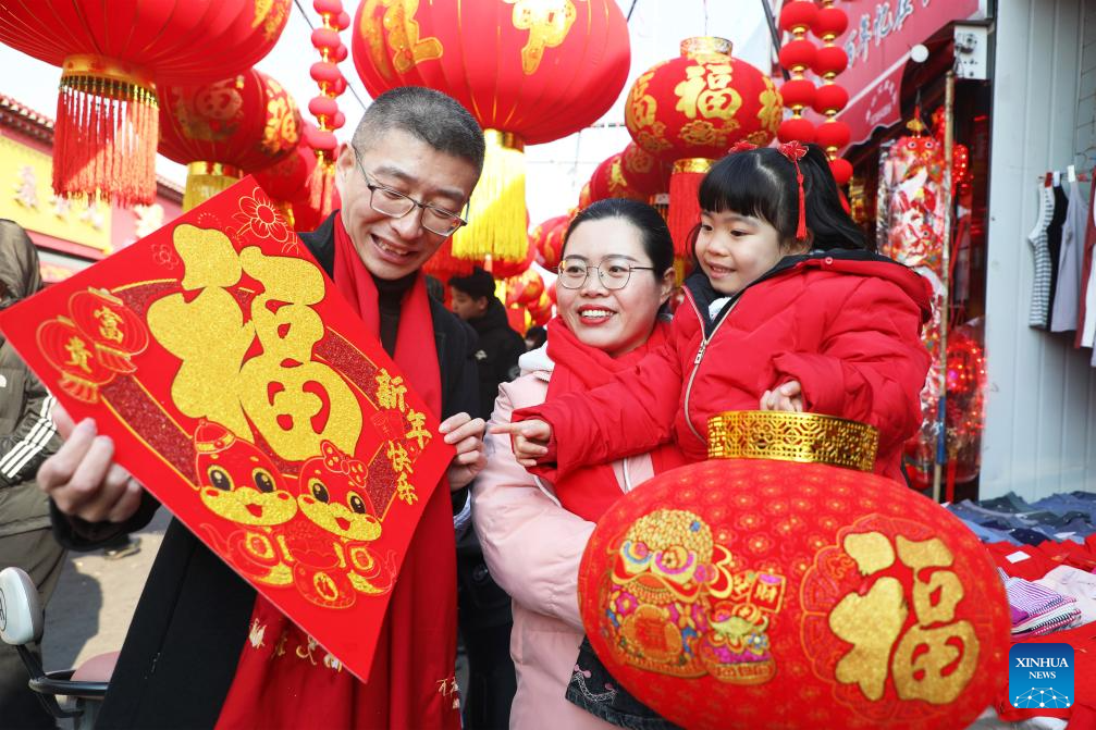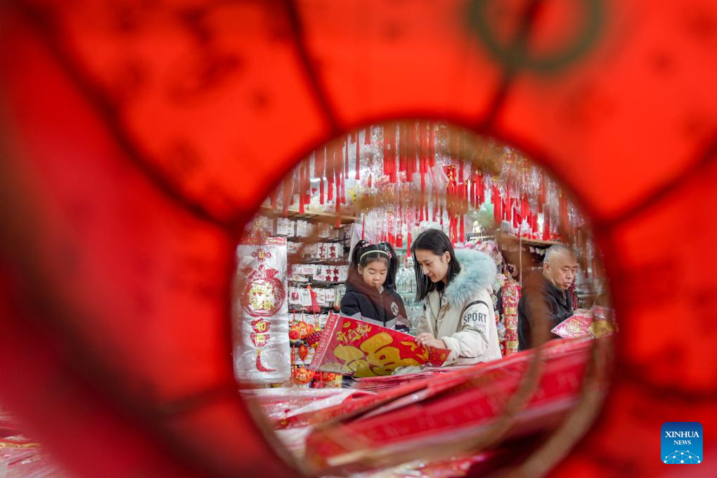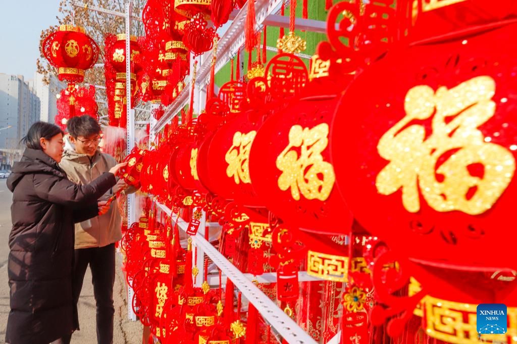 Customers select Spring Festival decorations ahead of the Spring Festival in Zunhua, north China's Hebei Province, Jan. 24, 2025. The Chinese New Year, or the Spring Festival, falls on Jan. 29, marking the beginning of the Year of the Snake. (Photo by Liu Mancang/Xinhua)