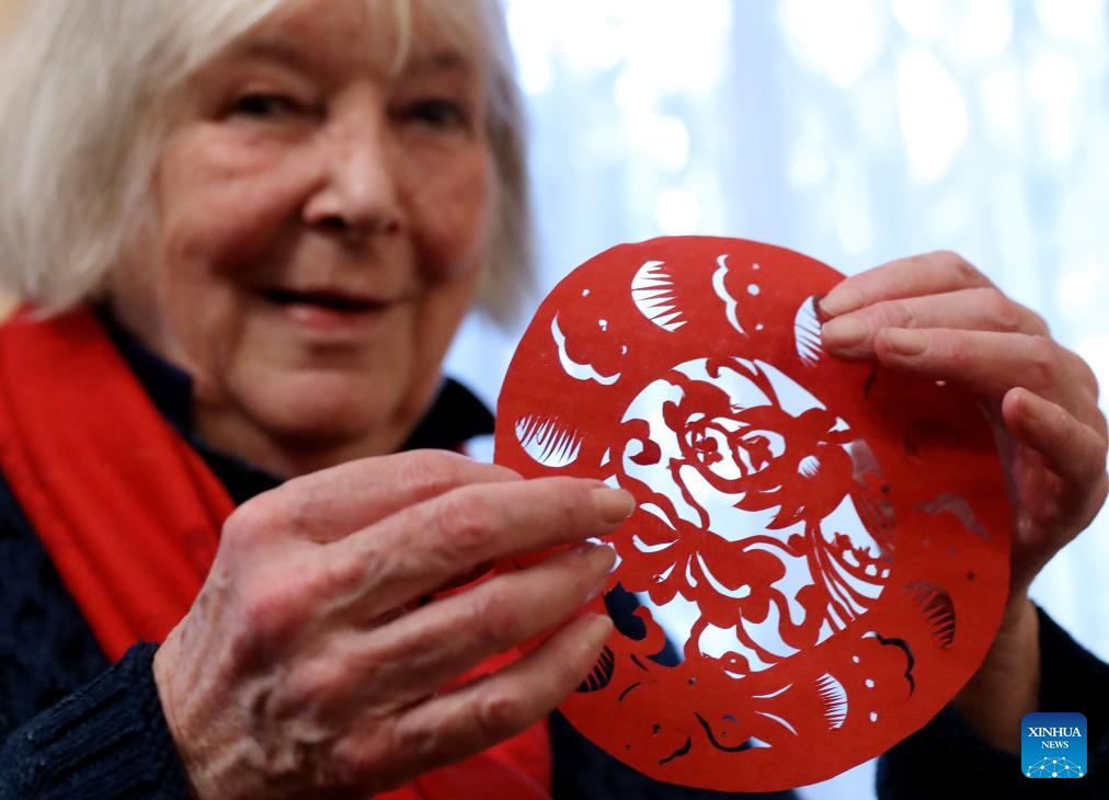 British sinologist Frances Wood shows a paper-cutting work during the "Intangible Cultural Heritage Yaji" event in London, Britain, Jan. 23, 2025. (Xinhua/Li Ying)